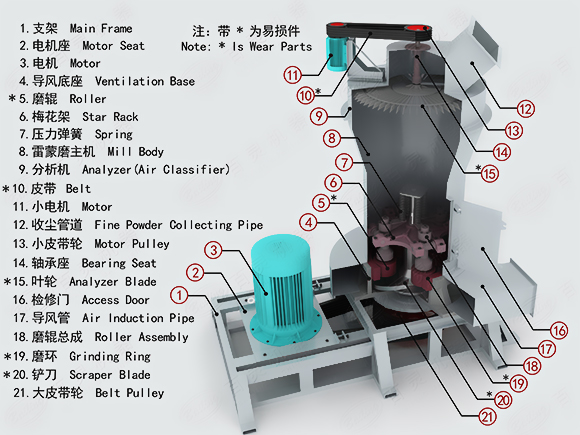 物料研磨后,風機將風吹入主機殼內(nèi),吹起粉末,經(jīng)置于研磨室上方的分析器進行分選,細度過粗的物料又落入研磨室重磨,細度合乎規(guī)格的隨風流進入旋風收集器,收集后經(jīng)出粉口排出,即為成品。風流由大旋風收集器上端的回風管回入風機,風路是循環(huán)的,并且在負壓狀態(tài)下流動,循環(huán)風路的風量增加部分經(jīng)風機與主機中間的廢氣管道排出,進入小旋風收集器,進行凈化處理。