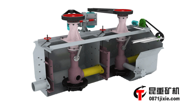 是由兩個(gè)浮選槽構(gòu)成一個(gè)機(jī)組,第一槽(帶有進(jìn)漿管)為吸入槽,第二槽為直流槽,此二槽之間有中間室。葉輪安裝在主軸下端,主軸上端有皮帶輪,用電動(dòng)機(jī)帶動(dòng)旋轉(zhuǎn)。空氣由進(jìn)氣管吸入。每組浮選槽的礦槳水平面由閘門調(diào)節(jié)。葉輪上方裝有蓋板和空氣筒(又稱豎管〉。空氣筒上開有孔,用來安裝進(jìn)漿管、中礦返回管或用作礦架循環(huán),孔的大小可通過拉桿調(diào)節(jié)。
