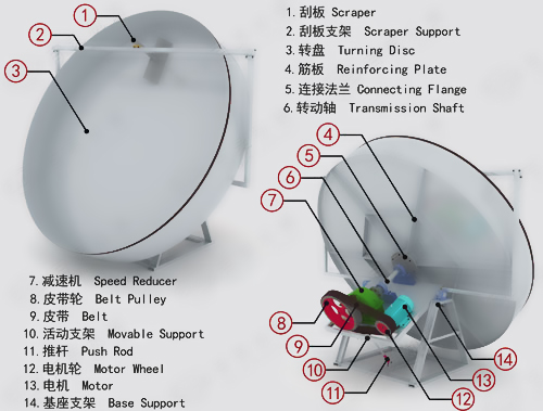 圓盤造粒機結構新穎合理,重量減輕,高度降低;工藝布置靈活方便,適合老廠改造。大盤傾角可調節;采用角度墊片,調整靈活方便。采用獨特的無動力組合刮刀一體化使輔助功率消耗降低。大盤由盤體和盤節組成;降低主電機功率;盤節沿盤體可上下調節;盤節端部為邊法蘭,料球出盤時可保證料球不被拉傷、撕裂。全新清淤設計,由無動力組合刮刀清邊清底,清角刮刀清盤角,配合盤體獨特處理技術,清淤、成球效果好,不會出現大泥團,料球直徑90%在3至5毫米。